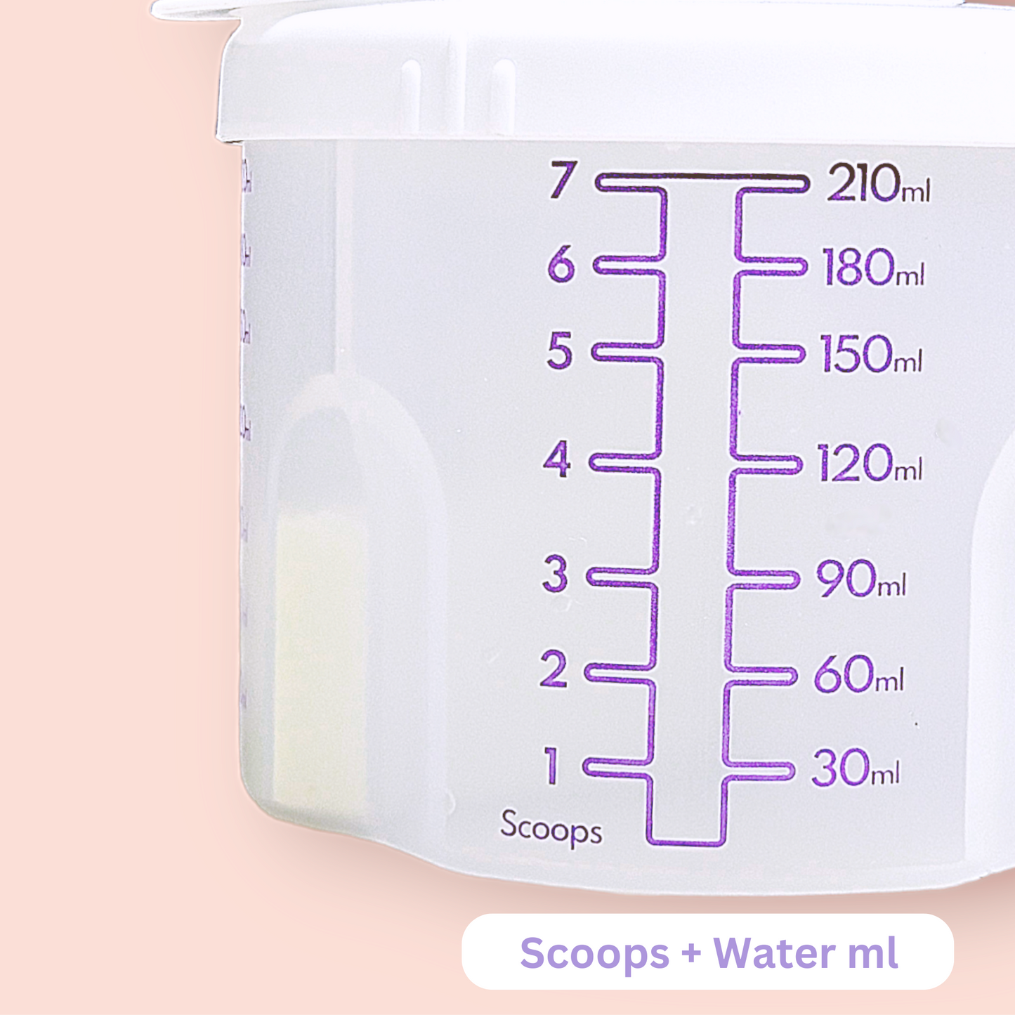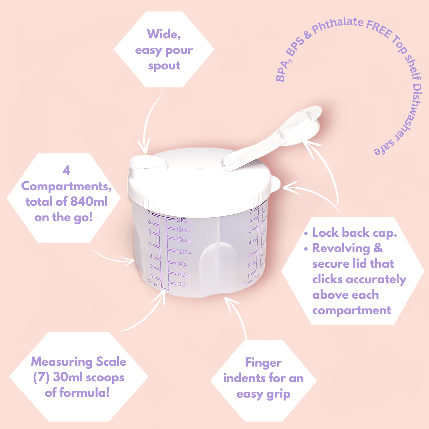 Experience peace of mind with our innovative formula dispenser, designed to simplify your life with little ones. Never again worry about second-guessing your scoop count, as each of the four compartments holds precisely 7 scoops (210ml) – a whooping total of 840ml of formula! Extend your adventures without the need for frequent refills, allowing you to focus on enjoying quality time on the go.